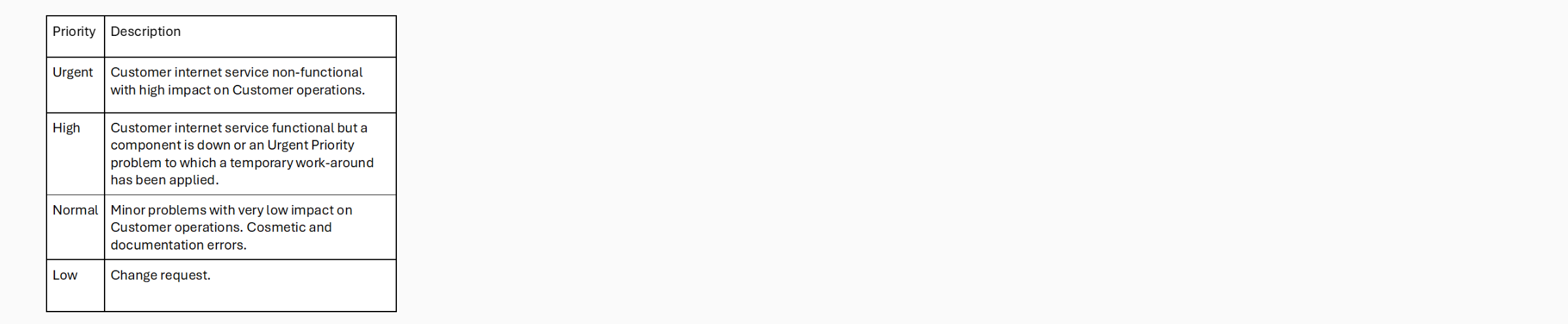 18.6 Response times as agreed between us and the Support Partner are indicative of the below table in relation to first response to the Customer and fixing of reported defects and faults.